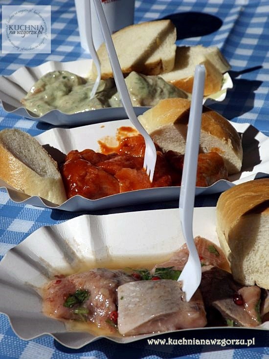 Śledzi były trzy rodzaje : z jogurtem i czosnkiem niedźwiedzim, salsa meksykańska z czerwoną cebulką, chutney indyjski z kolendrą i czerwonym pieprzem.