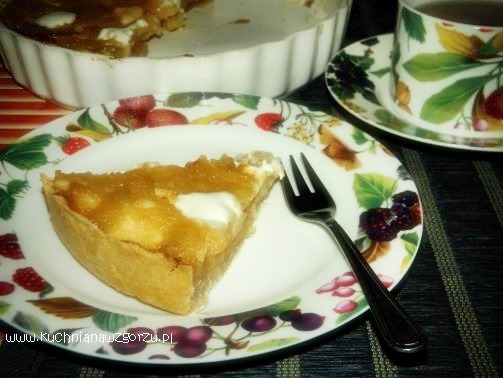 Na podpieczony spód wyłożyłam kilka łyżek masy krówkowej, potem nałożyłam jabłka. I całość raz jeszcze wstawiłam do piekarnika na ok. 30 min.