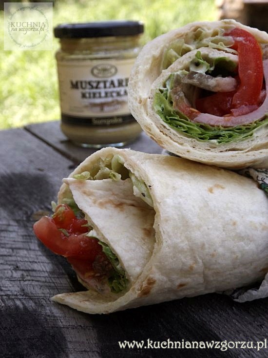 Wymieszać w miseczce serek i musztardę dodać przyprawy, wymieszać. Sosem posmarować tortillę, ułożyć na niej zieloną sałatę i wędlinę. Zwinąć w rulon i gotowe :)