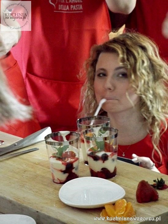Na początek było kilka słów o makaronach o tym co będziemy robić i kto nas będzie tego uczył. Okazało się, że uczyć nas będzie przemiły kucharz Andrea Scarantino, który na co dzień pracuje w restauracji Mamma Marietta. Warsztaty miały formułę – najpierw kucharz pokazuje co i jak zrobić, próbujemy gotowego dania a potem w trójkach gotujemy razem to danie.