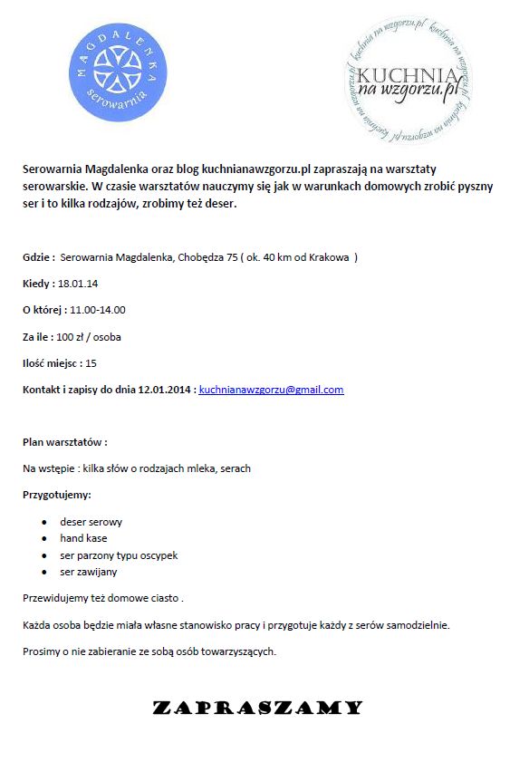 Warsztaty serowarskie 27 grudnia 2013 UlcikWarsztaty serowarskie odsłona 2014 czas start. Zapraszamy serdecznie : Share this: Click to email a link to a friend (Opens in new window) Email Click to share on Facebook (Opens in new window) Facebook Click to share on Pinterest (Opens in new window) Pinterest Click to print (Opens in new window) Print Related