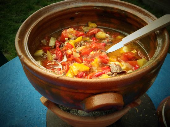 Boczek wędzony pokroiłam w kosteczkę nie za drobną, czosnek obrałam i pokroiłam w plasterki, pomidory i paprykę umyłam i również pokroiłam. Wszystko zostało włożone do garnka skropione oliwą i już. Zostało na noc w garnku stojąc na palenisku z żarem.