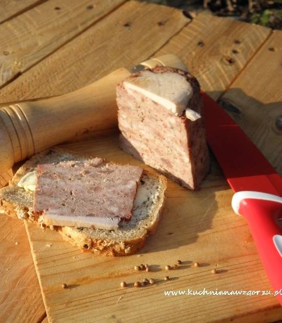 Wątróbkę z kurczaka opłukałam pod wodą i pokroiłam w kostkę. Podgardle wędzone pokroiłam w kostkę i usmażyłam na 1 łyżce oleju na patelni, dodałam wątróbkę i też ją podsmażyłam wraz ze słoniną .Pierś z kurczaka umyłam i przekroiłam na pół. Jedną pierś z kurczaka pokroiłam w kostkę i zmieliłam razem z pokrojonym karczkiem i surowym podgardlem wraz z podsmażonym już wcześniej mięsem. Po zmieleniu wszystko doprawiłam pieprzem,solą i papryką wędzoną. Małą kulkę nadzienia usmażyłam na suchej patelni żeby zobaczyć czy jest odpowiednio doprawione. Potem w szynkowarze na dnie ułożyłam pozostały filet z kurczaka, a potem dołożyłam resztę nadzienia. Zakręciłam szynkowar i całość gotowałam na minimalnym ogniu w wodzie przez 60 minut. Po tym czasie wyjęłam szynkowar i pozwoliłam mu wystygnąć i wędlina gotowa :) Zniknęła w zastraszającym tempie. I tak to na kolejną wędlinę już czas niedługo.