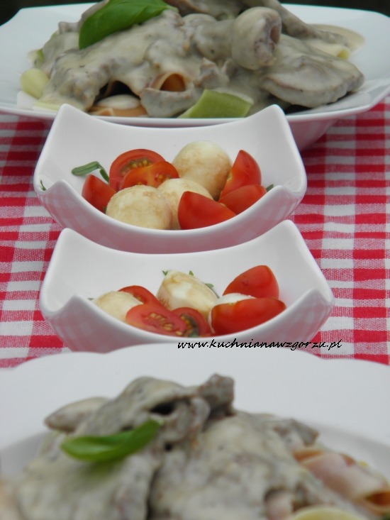 Do tego przygotowaliśmy najprostszą sałatkę czyli małe mozarelle podane z pomidorkami koktailowymi polane octem balsamicznym.